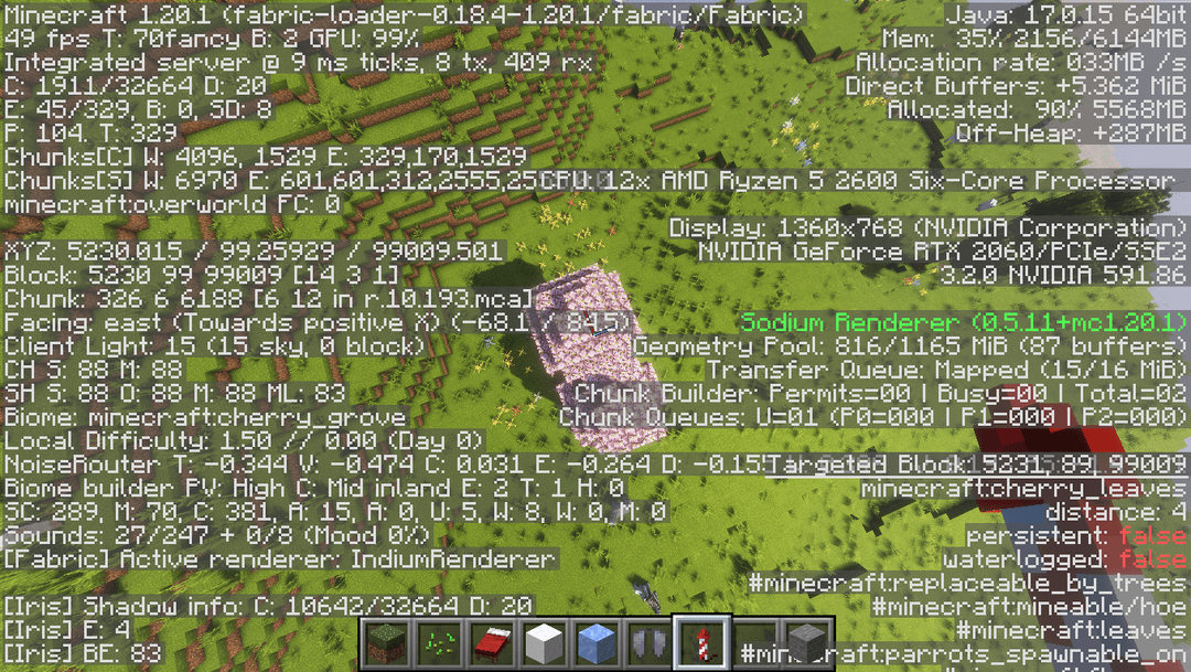 Z:100,000でこれを見つけました。ゲームは、平地に完全に囲まれた、1 本の木にちょうど十分な大きさのチェリー グローブ バイオームを生成することにしました。蜂の巣もありますよ! 10億分の1の発見? (Javaのみ)シード: 5404443002576357863 座標: X:5228、Z:99007 by BirdMaster5695