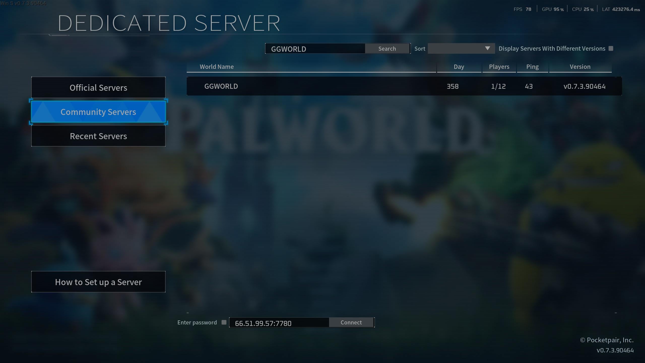 みんなとても穏やかでリラックスしています。私たちは新しい仲間を助けるのが大好きです!! 🌍 Palworld サーバーに参加する方法 私たちのサーバーに飛び込みたいですか?次の手順に従います。 🔎 方法: 検索 パルワールドの立ち上げ 「マルチプレイヤーゲームに参加」をクリックします 「コミュニティサーバー」タブに移動します 検索バーに次のように入力します。 GGワールド サーバーをクリックして「接続」をクリックします by guccibacksss
