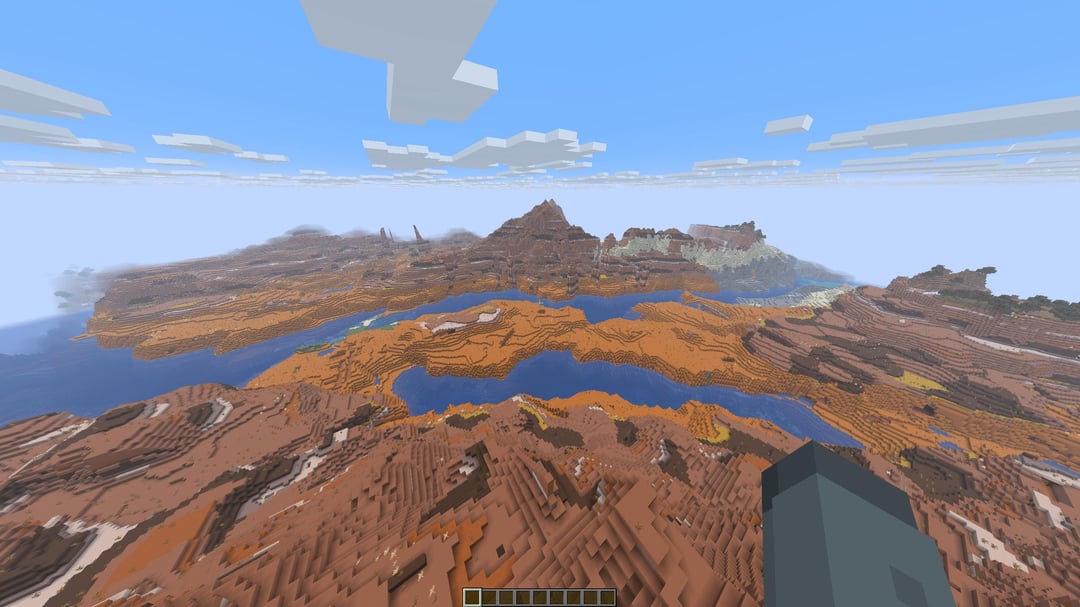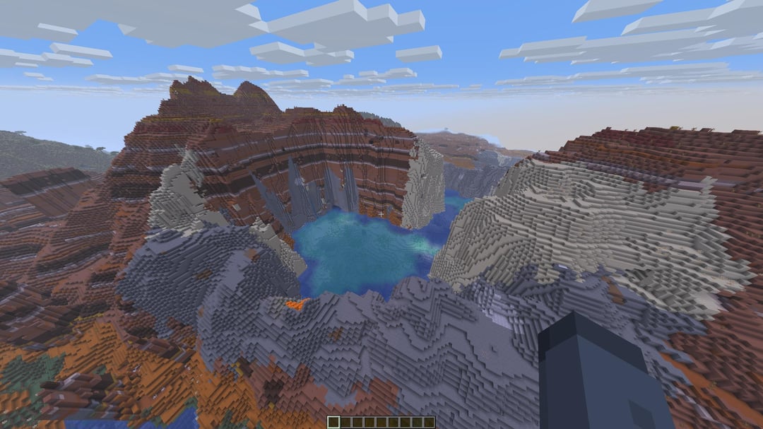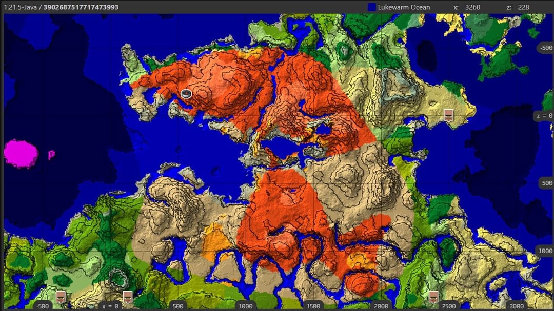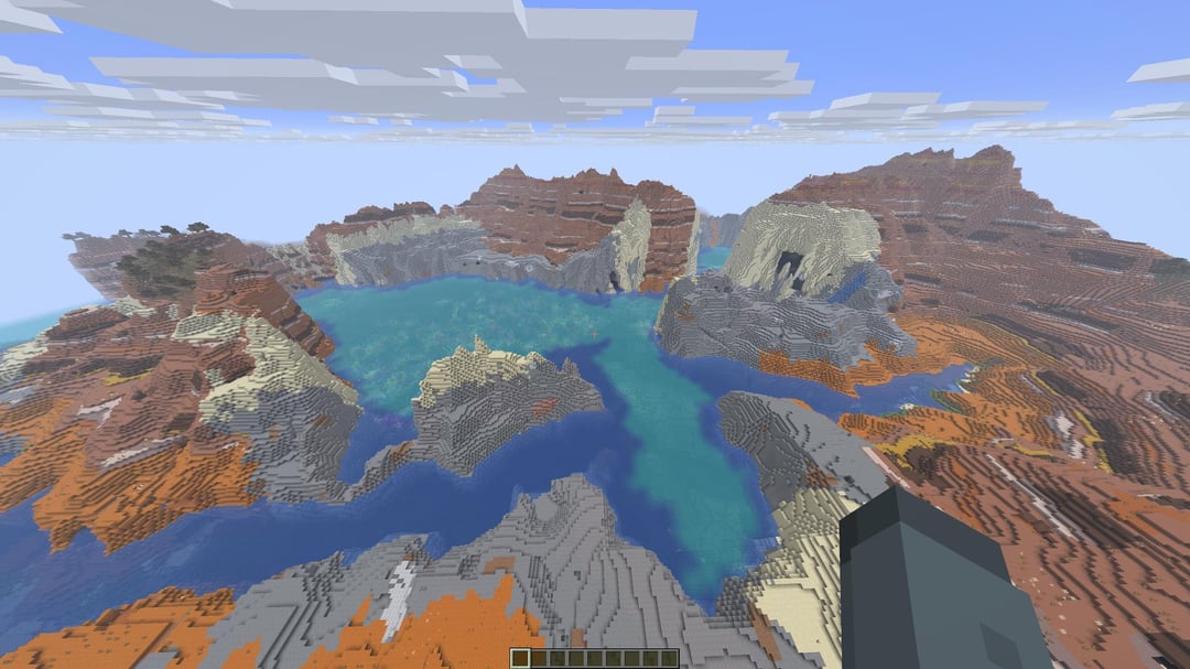 これまでここに投稿したことはありませんでしたが、これはちょっとクールだと思います。西の海岸沖にはキノコ島、東と南にはストーニー ピークス、北にはチェリー グルーヴス、そして南海岸には廃墟となったネザー ポータルもあります。