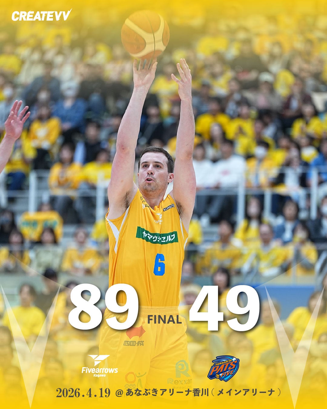 GAME REPORT B3 REGULARSEASON 2025-26 第29節【GAME2】 HOME ■日時:2026年4月19日(日) 14:00 TIP OFF ■会場:あなぶきアリーナ香川(メイン) 香川ファイブアローズ 89(30-10-28-21) 山口パッツファイブ 49(12-15-10-12) BOX SCORE・PLAY BY PLAY 籔内幸樹HC コメント アレックス・デイビス選手 コメント 根來新之助選手 コメント