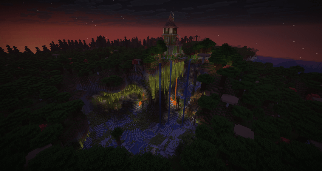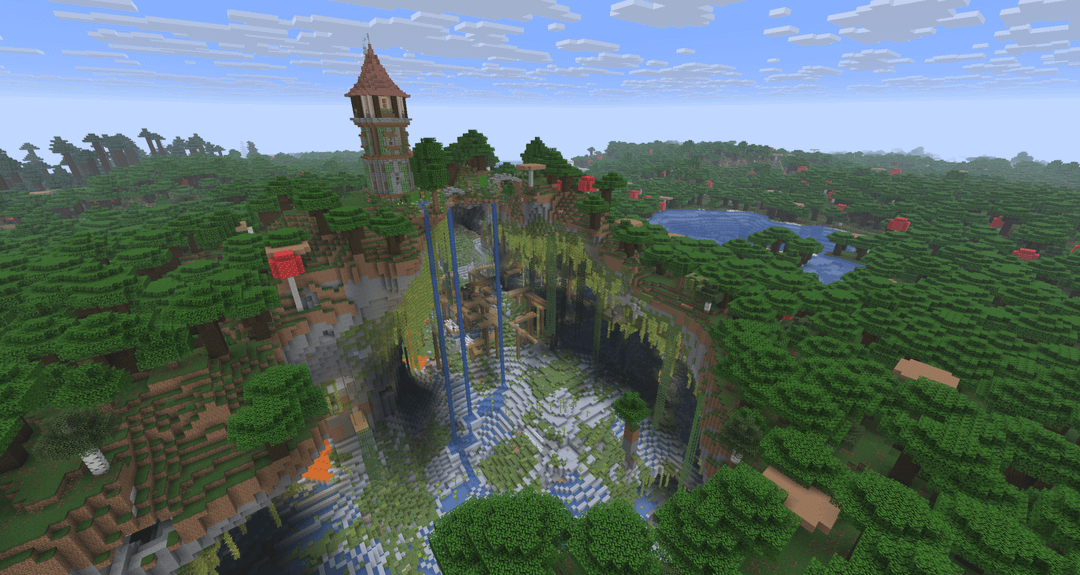 これに似た、露出した巨大な洞窟とその上に陸地が浮かんでいる種子をさらに探しています。森林バイオームの緑豊かな洞窟が望ましいです。