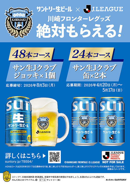 4月20日(月)からスタートのサントリー生ビール「絶対もらえる!サン生×Jクラブグッズキャンペーン」を記念しまして、サントリー製品(お酒)が当たる抽選会やクラブ創設30周年記念TAG LIVE LABEL缶を販売いたします。