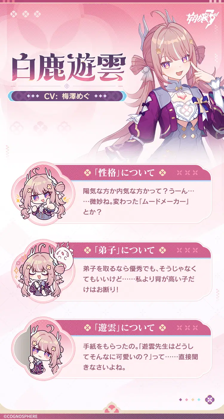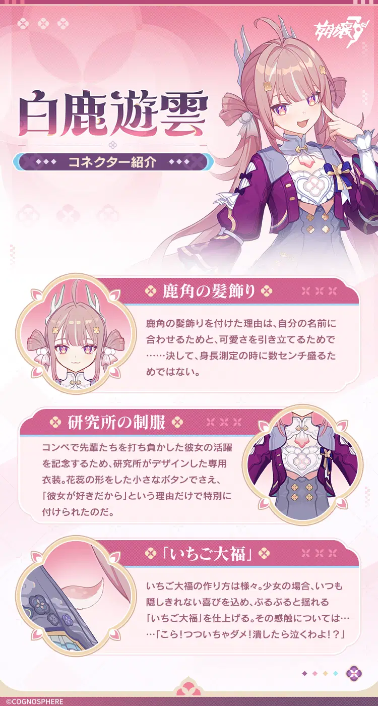 終末のカウントダウンがチクタクと響く中、少女は涙と共に、心の中の不安を拭い去った。 そして、駆け回りながら叫ぶ小さな姿が人々の目に映り、彼女の勇気も強い言葉へと変わった—— 光の輝きは、決して一瞬で終わるものではない。 ふと、小さな彼女は高くそびえる灯台のようで、「未来」もその光に導かれ、前へと進んでいく。 新たなコネクター「白鹿遊雲」はVer.8.8で登場予定!お楽しみに!