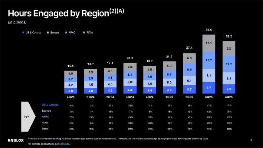 利用時間の推移では2025年第3四半期には400億時間を記録。総プレイヤー合計で一月あたり平均100億時間をRoblox上で過ごしている計算だ。
