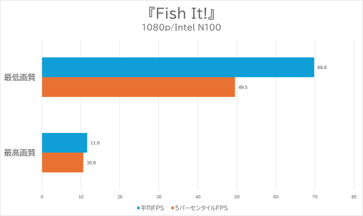 最低画質設定では平均69.8fpsを記録し、60fpsの動作目標をクリア。
