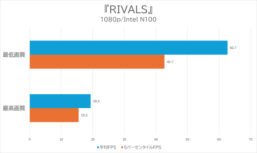 最低画質設定では平均62.7fpsを記録し、60fpsの“遊べる”水準は超えられる。