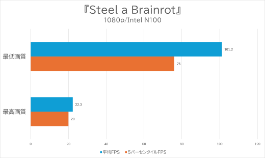 最低画質設定では平均101.2fpsを記録し、60fpsを軽く超えて動作。120Hzモニターとの組み合わせも十分意味のあるフレームレートとなっていた。