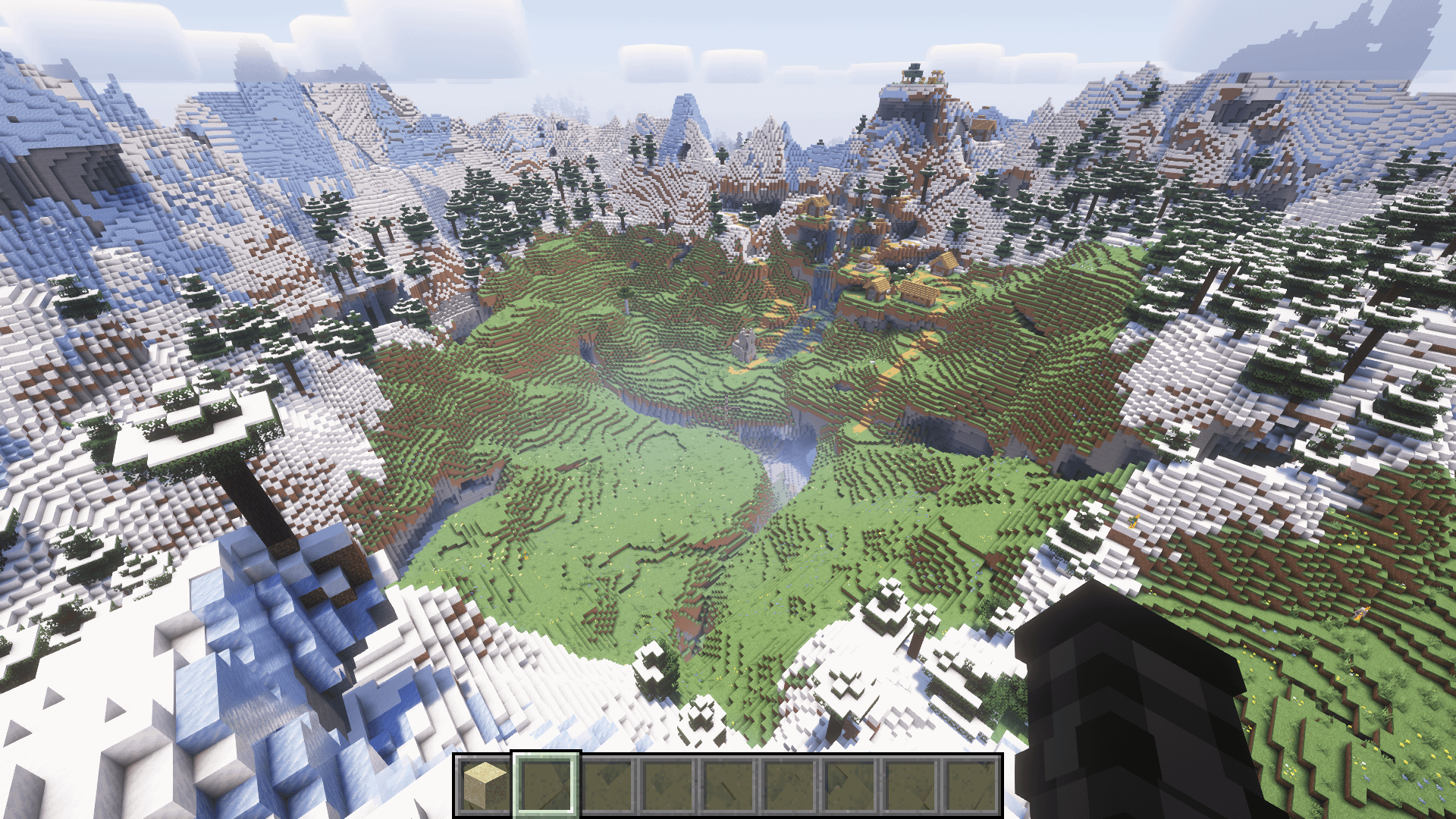 あなたは凍てつく海の前にスポーンします。山に向かう途中でイグルーの前を通る可能性が高いでしょう。凍結したピークの山の 1 つ (/tp -1748.06 115.00 -243.21) には、中央に大きな洞窟と村のある巨大なクレーターがあります。山の近く (/tp -1436.43 80.00 66.02 5) に村があり、近くに露出した緑豊かな洞窟の穴がたくさんあります。山を探索すると、さらに露出した緑豊かな洞窟が見つかります。