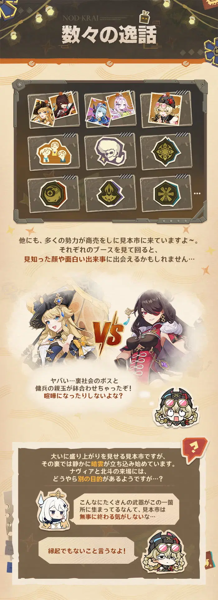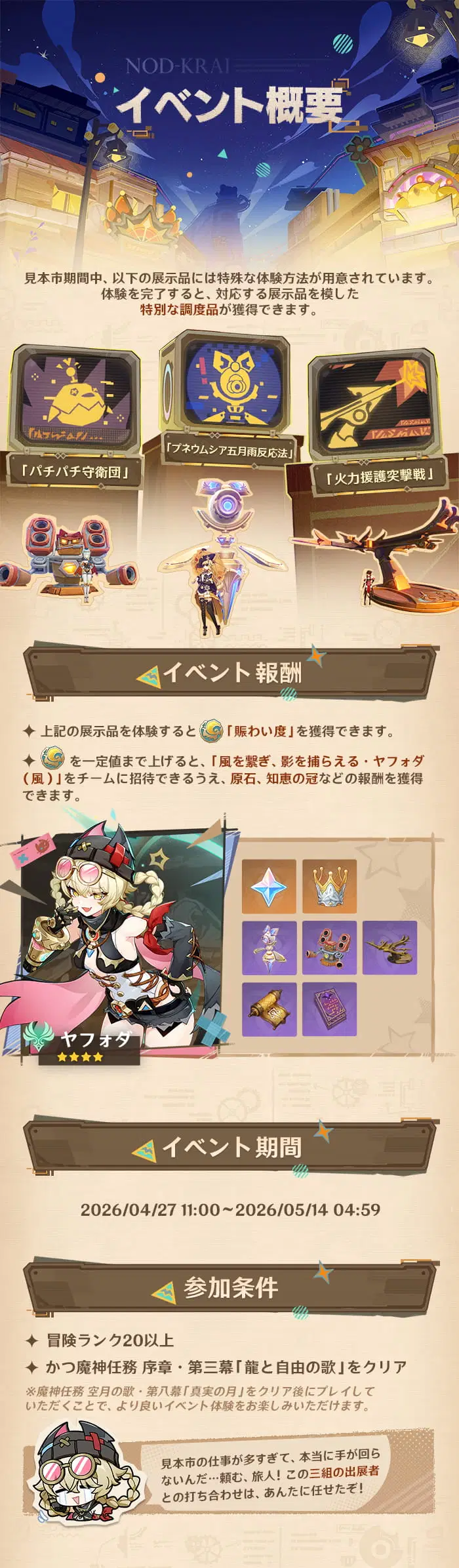 ナド・クライ見本市がまもなく開幕!「自由取引」の理念を掲げ、ヴォイニッチ商会が主催し、安全も保障されています! 「波と岩礁の邂逅」イベントおよびストーリーは2026/04/27 10:00に開放されます。イベントに参加すると「風を繋ぎ、影を捕らえる・ヤフォダ(風)」をチームに招待することができ、さらに原石や知恵の冠などの報酬も獲得できます。