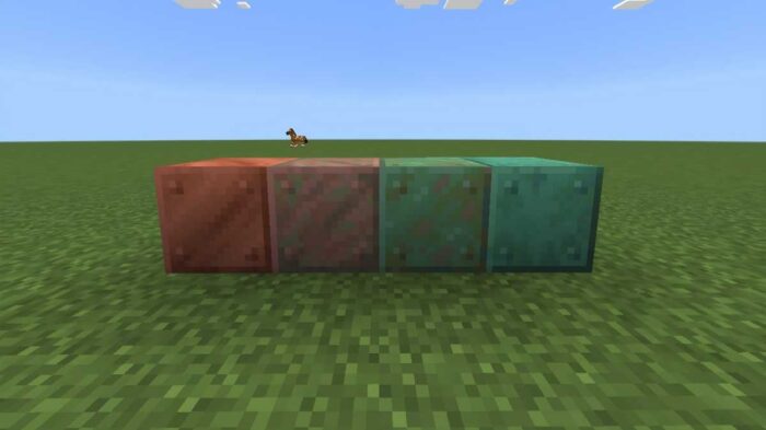 銅の使い道として、銅ブロックや銅ゴーレムがあります。銅関連のアイテムは「時間の経過」でサビる特性があり、定期的にオノで磨かないといけません。