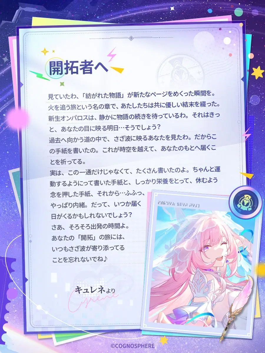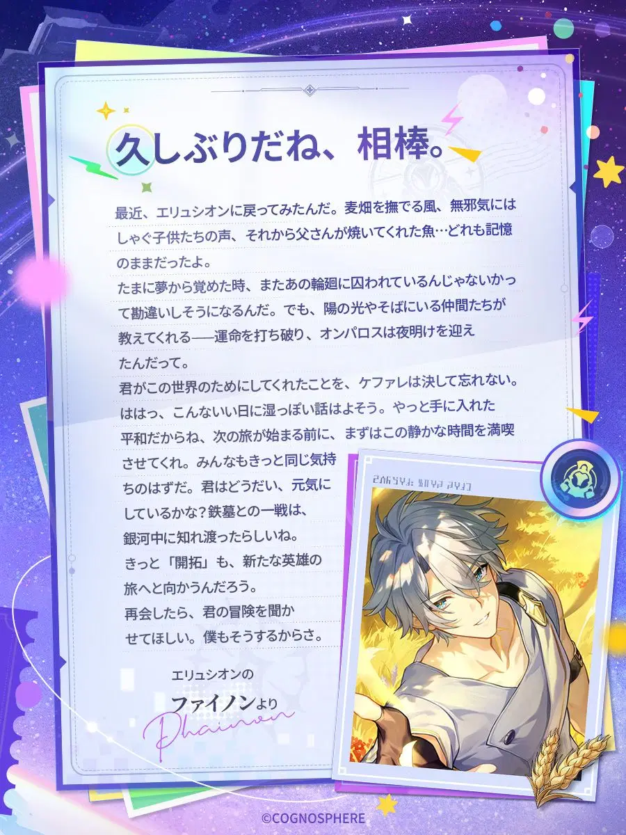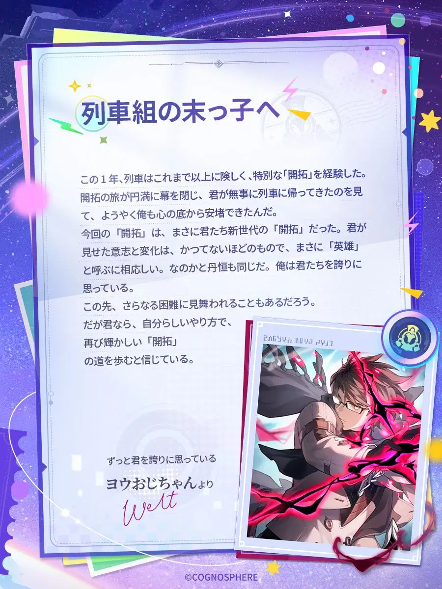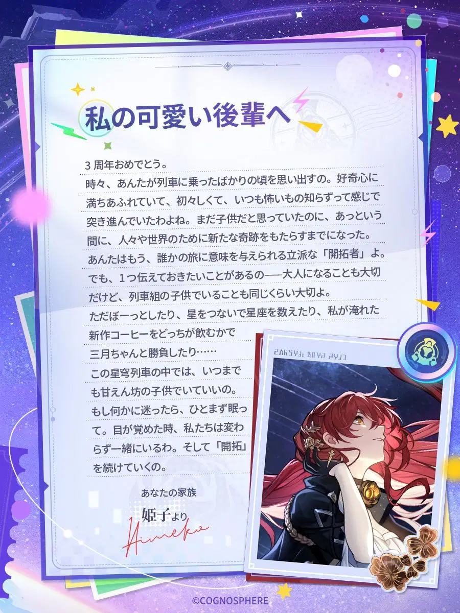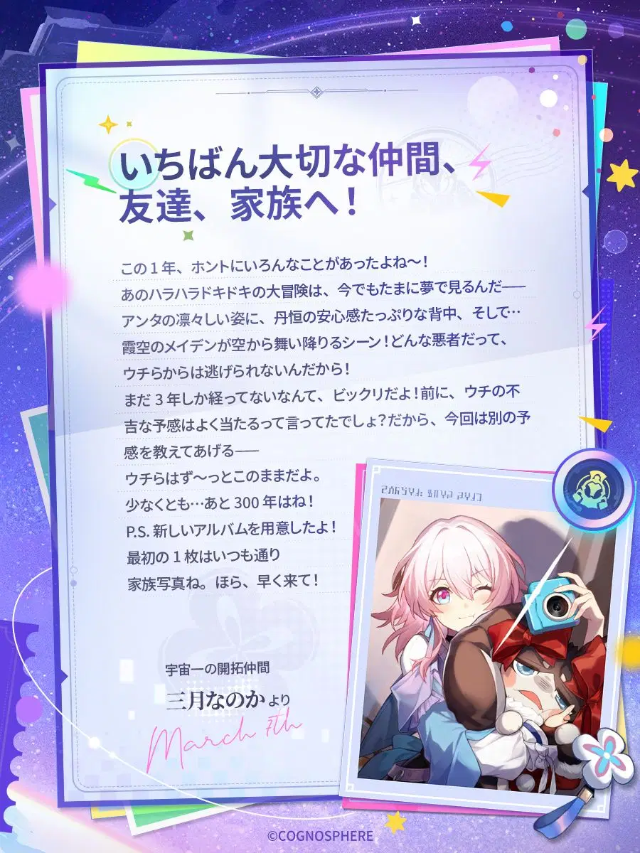 Share Facebook Twitter LinkedIn Pinterest Bluesky Reddit Threads 親愛なる開拓者様、共に歩んで3年の月日が経ちました。開拓とは未知に向かって進むこと——その過程には、数えきれないほどの驚きと喜びがありました。 旅で出会った仲間から、どんな祝福が届いているか見てみましょう。 星穹列車の家族も、そして異なる運命を歩む仲間たちも…あなたの開拓がみんなを繋いでいます。 3周年を祝して——この旅が、いつか群星に辿り着かんことを! また、ゲームにログインして星玉×1,600と燃料×10を受け取るのもお忘れなく!