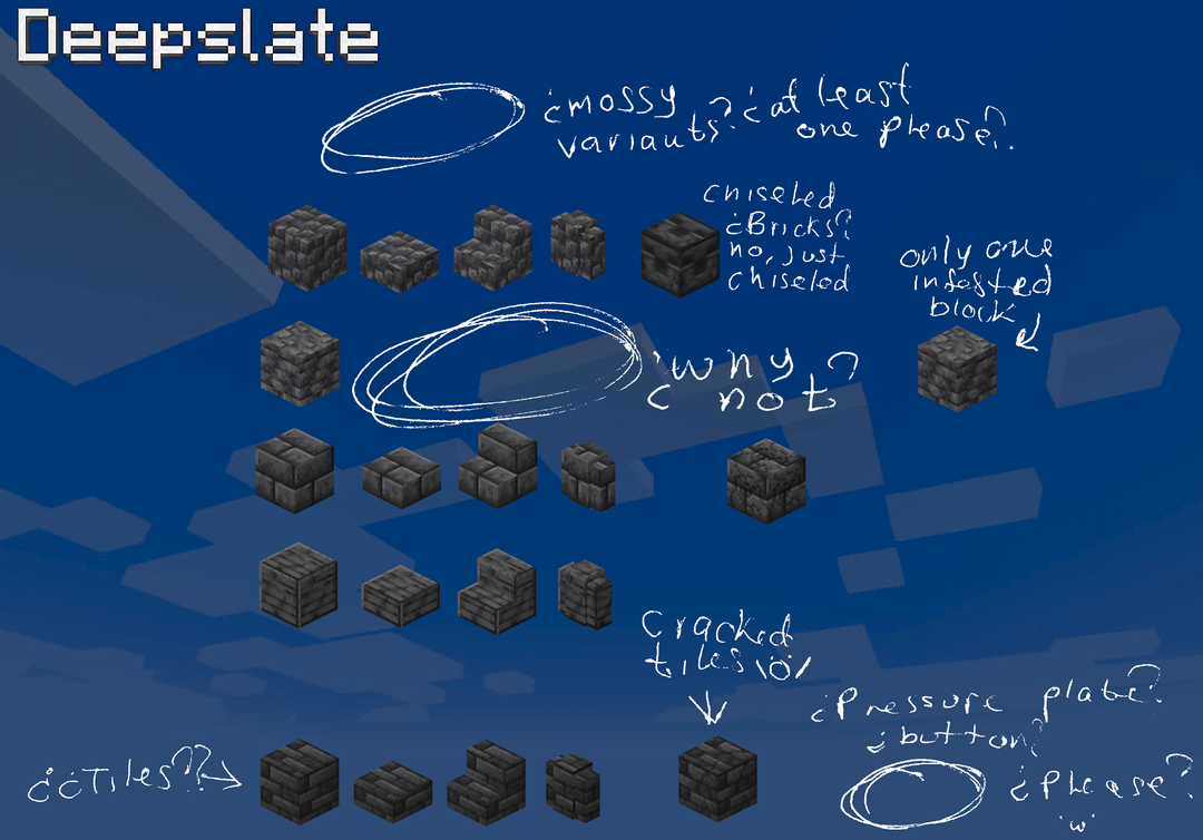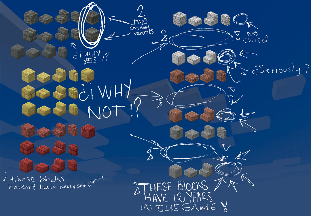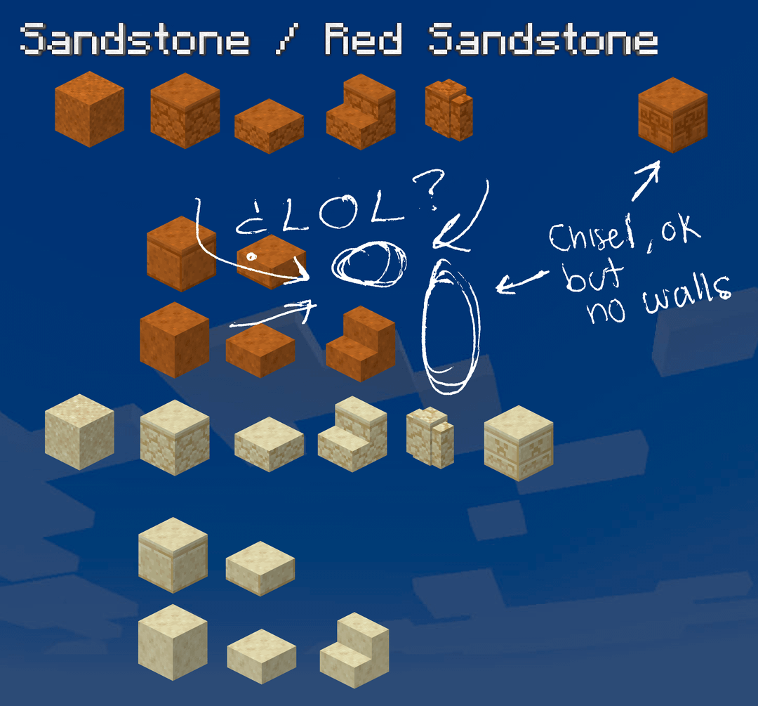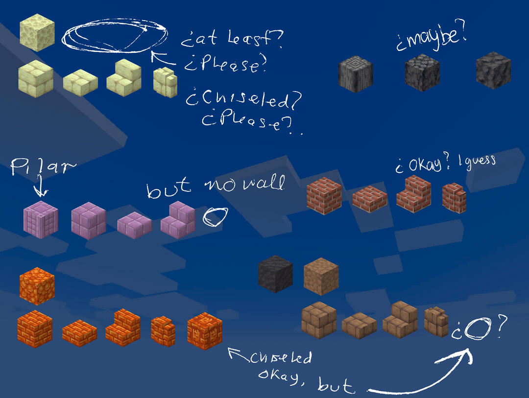 一方、通常の石の壁ではなく深スレートの壁のバリエーションが 4 つあり、黒石の壁のバリエーションが 3 つありますが、安山岩、花崗岩、閃緑岩の磨かれた壁のバリエーションはありませんが、凝灰岩、硫黄、辰砂の壁が 3 つあります。真剣に、安山岩/花崗岩/閃緑岩の壁を磨いていない理由はありますか?私たちは白、緑、青の壁が必要です。すでに 7 ~ 8 種類の黒のエッジの効いた壁と 7 ~ 8 種類の灰色の壁のバリエーションがあります。砂岩の壁または滑らかな砂岩の壁をカットする必要があります (笑) ¿なぜそうではありませんか?新しいブロックは完全にパレット化されているように感じますが、1.8 と 1.14 以降、古いブロックは何もせずにただそこに座っているだけです