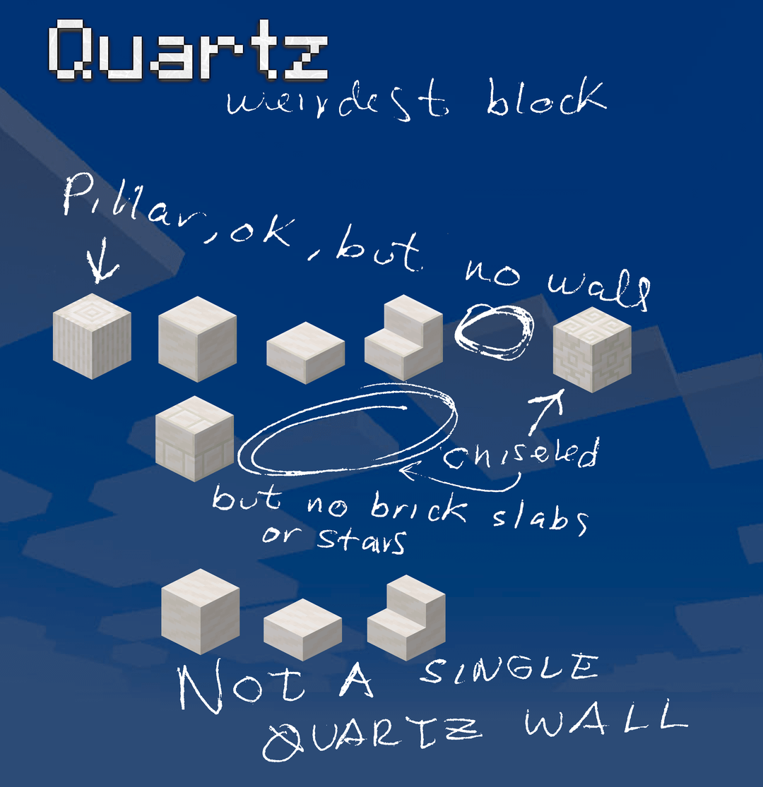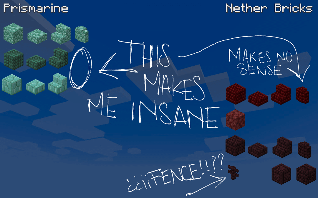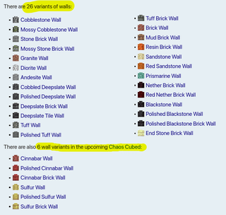 壁から始めて、壁は 26 個しかありませんが、Chaos Cubed は、壁が必要な残りのブロックを修正することなく、さらに 6 個 (ゲーム内の壁の 23% パーセント以上に相当します) をもたらします。石英の壁はありませんが、「泥の壁と樹脂の壁」はあります。また、プリズマリンの壁はありますが、ダークプリズマリンの壁はありません。「なぜですか?」 3 つのブロックのスラブと階段はありますが、通常のプリズマリンの壁しかなく、他の 2 つのバリエーションの壁がないため、意味がありませんが、赤いネザー レンガの壁とネザー レンガの壁があるため、意味もありません。