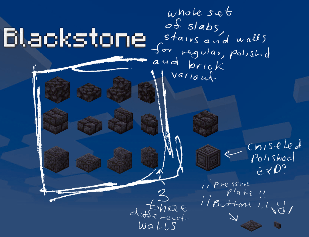 おそらく、おそらく、ブラックストーンは、ブロックが特徴づけるべきものの最小限の例であると思います。おそらくすべてのブロックがひび割れた磨かれた滑らかな苔むしたタイルに値するわけではありませんが、少なくとも通常のブロック、磨かれたブロック、レンガの 3 つのバリエーションの階段、スラブ、壁のセット全体が必要です。感圧板、ボタン、彫りの深いブロック。すべてのブロックにひび割れや苔むしたバリアントがなければ大丈夫だと思いますが、アメジストのようにまったくバリアントがあってはいけないブロックもあるかもしれませんが、方解石とドリップストーンは注目のコーナーにあります。ネザーラックも同様ですが、この時点でネザーラックをどうしますか?ネザーラックのスラブや階段は見た目が良くないと思いますが、一見すると呪われているように見える石のスラブや階段もあります。