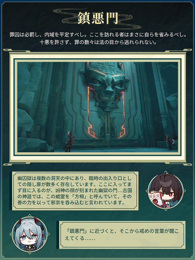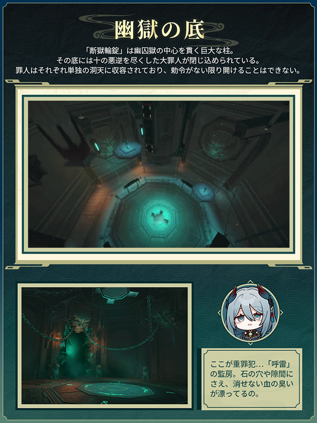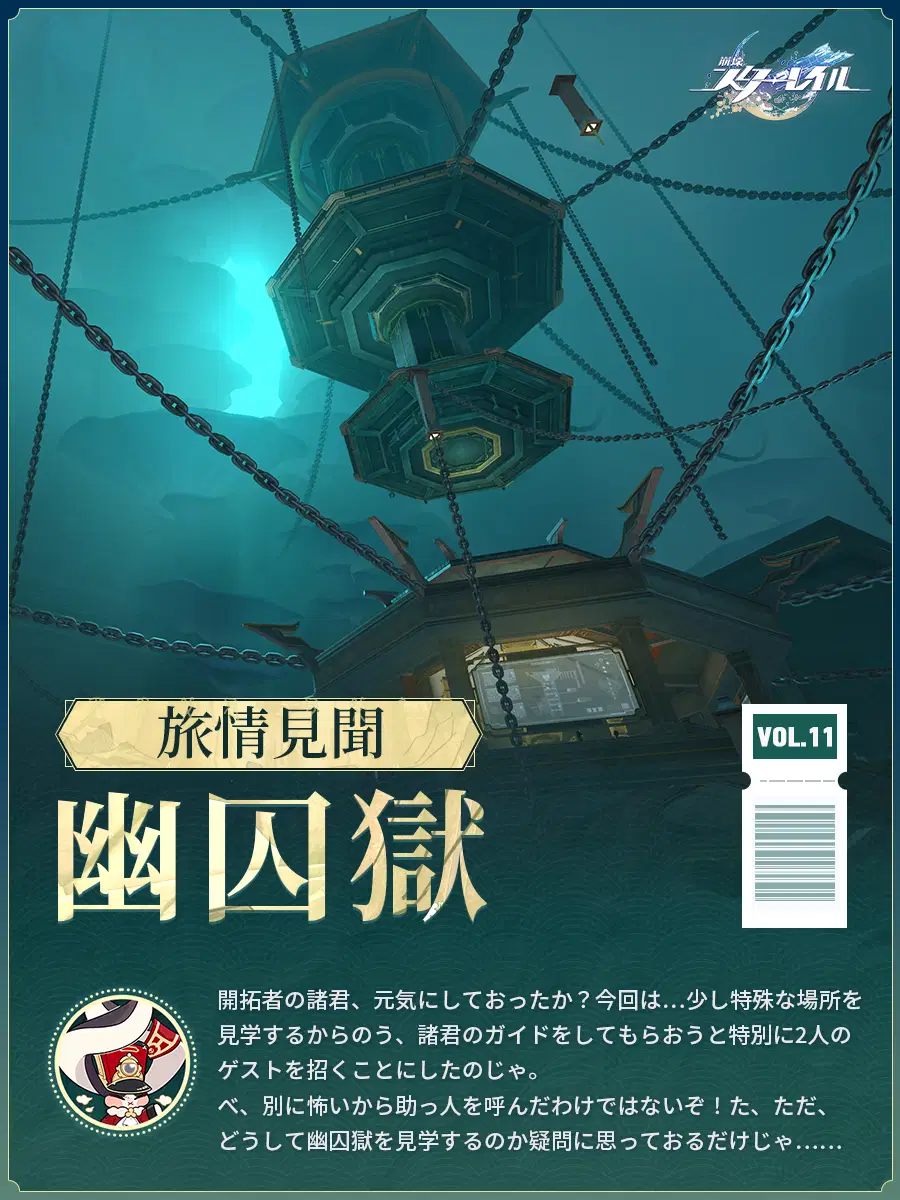 「鱗淵境」より窺い知れず、 「綏園」よりも恐ろしい場所とは? 皆様、旅情見聞へようこそ。今回は雪衣、寒鴉と一緒に、仙舟「羅浮」の「幽囚獄」を見学しましょう。 パムの一言:べ、別に怖いから助っ人を呼んだわけではないぞ!た、ただ、どうして幽囚獄を見学するのか疑問に思っておるだけじゃ……