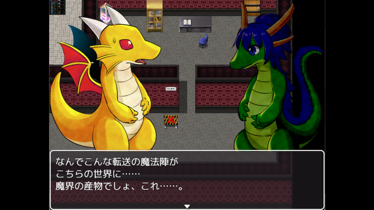 冒険の舞台となる館の中には、RPGのような要素が盛り込まれており、置かれているツボやタルを調べることで、主人公である二匹のドラゴンのゆるいやりとりを垣間見ることができる。謎の館の正体も、置かれている日記などを調べると次第に明らかになっていくことだろう。