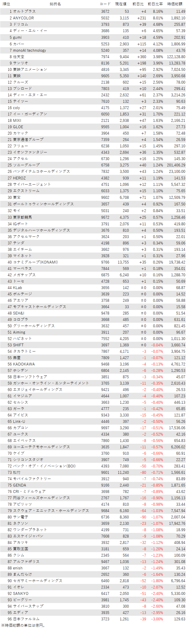 こうしたなか、ゲーム・エンタメ関連企業をみると、登録されている96銘柄のうち、上昇は43銘柄(45%)、下落は44銘柄(46%)、変わらずは9銘柄(9%)で、下落した銘柄の方が多かった。主力株に資金が向かったため、ゲーム・エンタメ関連は物色の対象になりづらかったようだ。