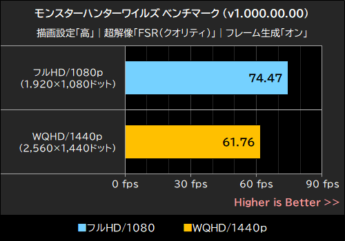 ベンチマークの結果、平均フレームレートはフルHD/1080pで「74.47fps」、WQHD/1440pで「61.76fps」を記録。多くのゲーマーが快適なプレイの指標にすることが多い平均60fpsをどちらの解像度でも超えることができた。