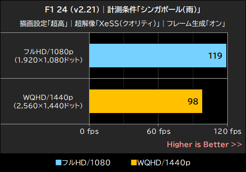 ちなみに、ベンチマークモードの標準設定であるバーレーンのドライコンディション(晴れ)で同様にテストを実行した場合、平均フレームレートはフルHD/1080pで「184fps」、WQHD/1440pで「142fps」だった。
