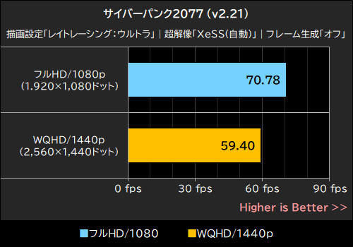 テスト時点のゲームバージョン(v2.21)ではXeSS 2のフレーム生成を利用することはできないが、Arc B580 Steel Legend 12GB OCはフルHD/1080pで「70.78fps」、WQHD/1440pで「59.40fps」を記録してみせた。高画質設定のサイバーパンク2077を十分にプレイできるパフォーマンスだ。