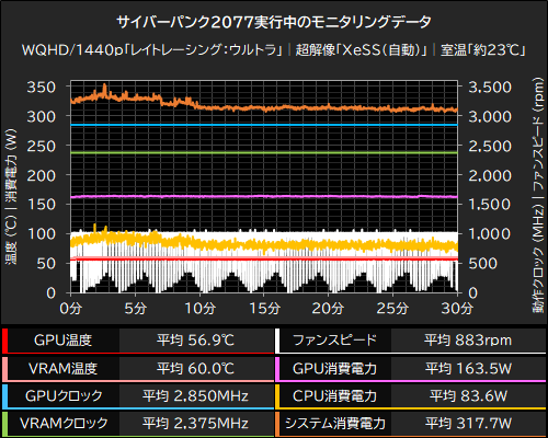 Intel Arc B580 Steel Legend 12GB OCの冷却性を確かめるべく、サイバーパンク2077をWQHD/1440pで30分連続実行しつづけた際のモニタリングデータを計測してみた。テスト時の室温は約23℃。
