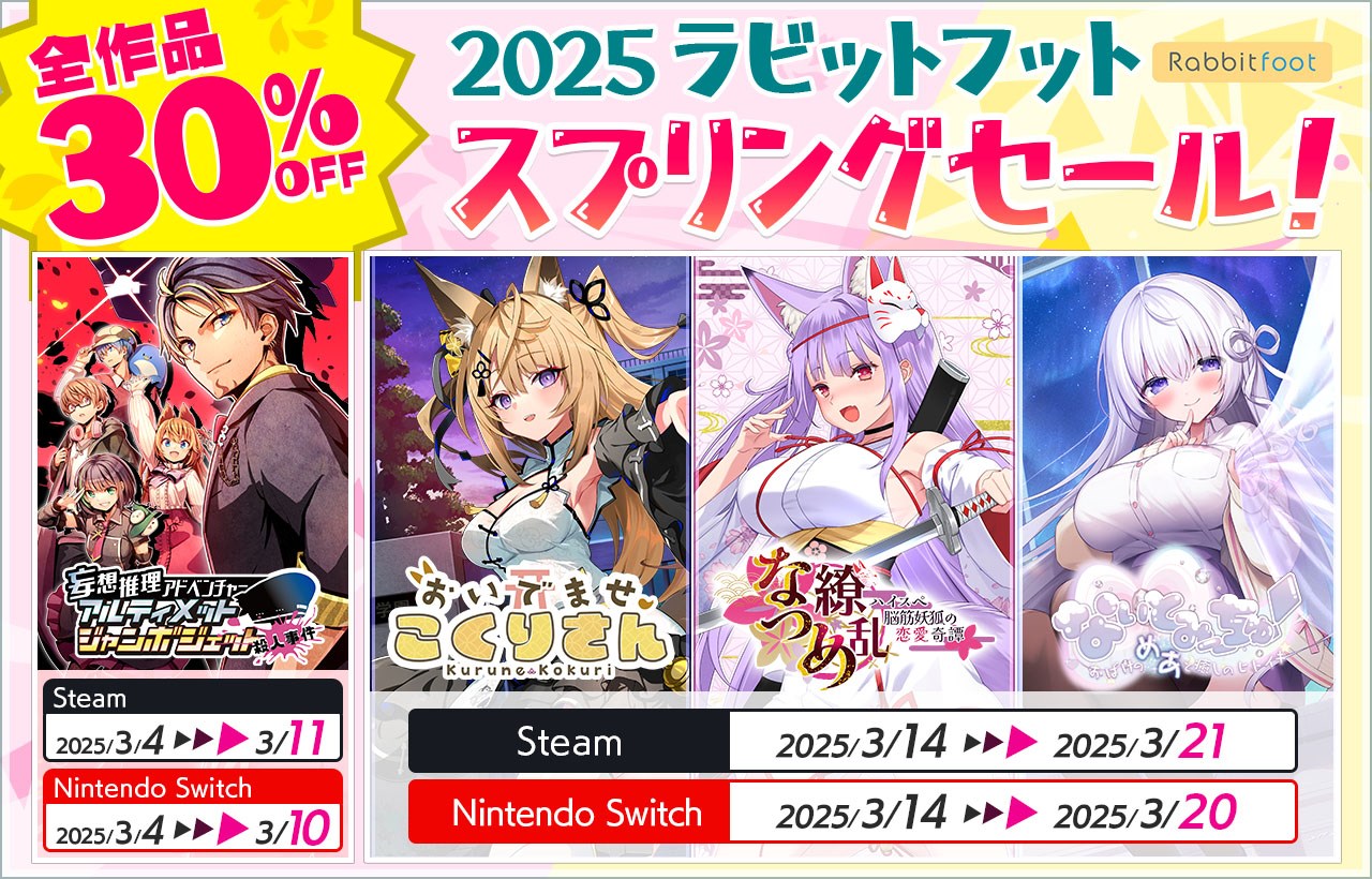 サイバーステップ<3810>は、ノベルゲームブランド「Rabbitfoot」の人気ノベルゲーム4作がSteamストアおよびニンテンドーeショップにて30%OFFとなる「2025 ラビットフット スプリングセール!」を開催することを発表した。