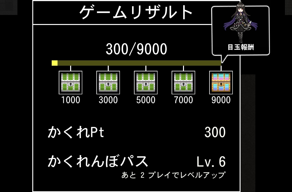 両プレイヤーとも、ゲーム終了時の結果に応じて「かくれPt」を獲得できます。このポイントを一定値貯めると、豪華な報酬が手に入る「かくれんぼ宝箱」を入手できる。