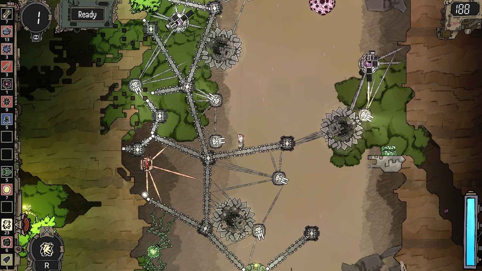 ゲームが進むとタレットを搭載した構造物ごと移動できるようになる。昼夜の区別なく過酷になっていく環境に対して、移動要塞で対抗するかたちだ。タレットは複数のものを組み合わせて、より強いものを開発することができる。また、お掃除ロボット自身の成長要素もあり、移動速度や掘削速度の上昇、タレットの性能上昇や消耗品使用時の効果上昇といった、さまざまな強化が可能となっている。