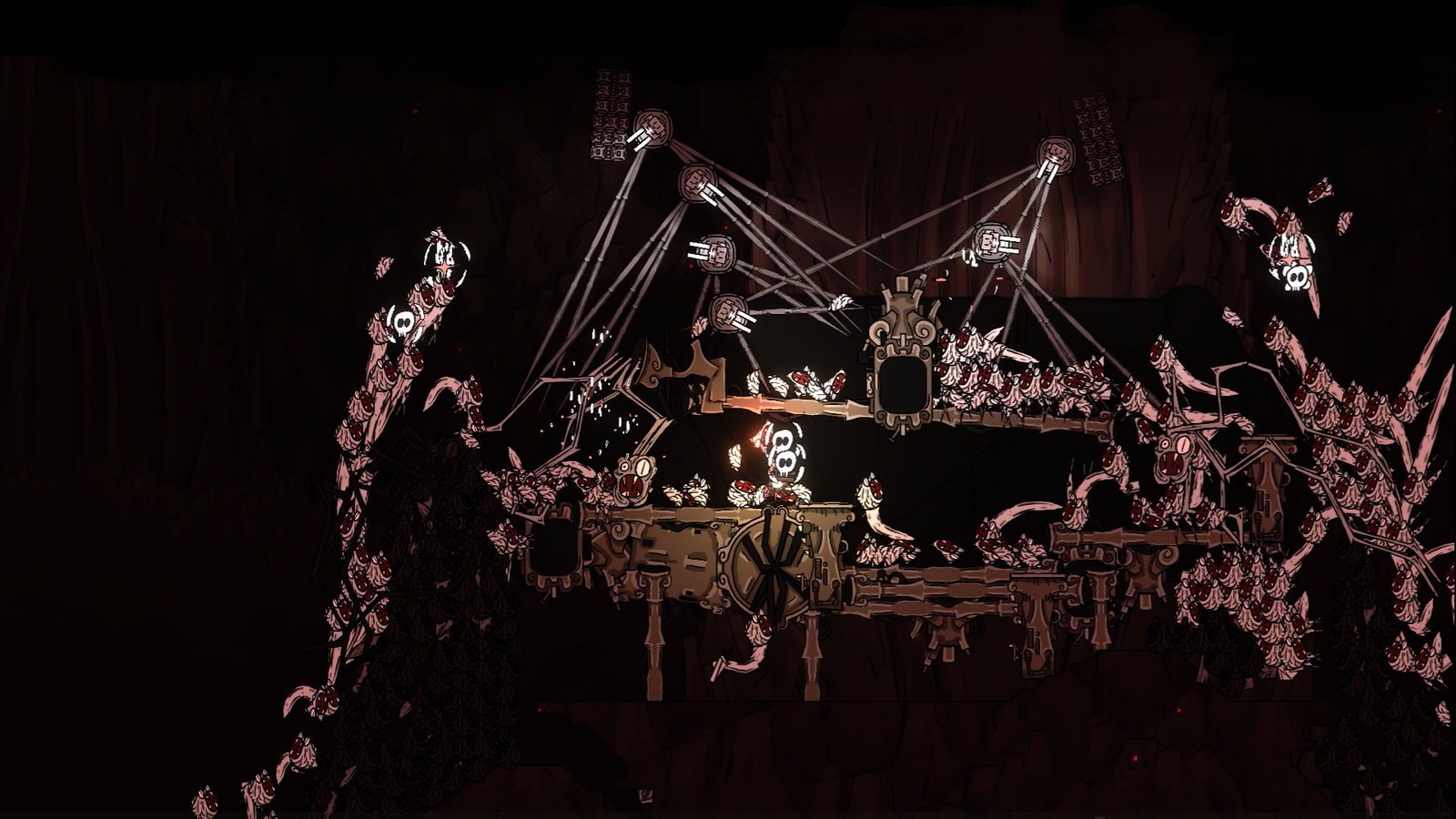 そこでプレイヤーは地面に埋まっている鉱物や、生えている植物などの資源を集め、タレットといった設置型兵器やドローンといった自動兵器を作成して夜を乗り切ることになる。資源集めのための探索と、タワーディフェンスのような防衛を繰り返しつつ、さらなる深みを目指すのが序盤の基本的なゲームサイクルだ。ちなみにワールドはプレイごとに変化するため、毎回違った資源を使って夜に備えなければならない。