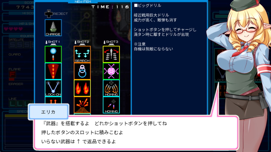 「後方爆撃弾」「敵弾を弾き返すバリア」など個性的な武器を3つのスロットに割り振ろう。