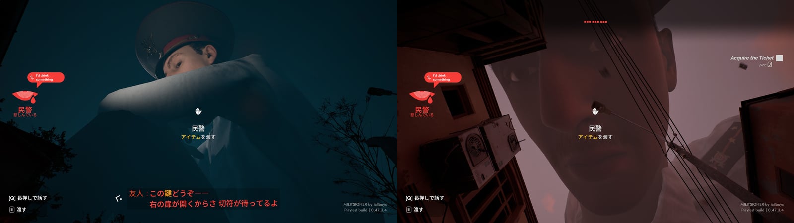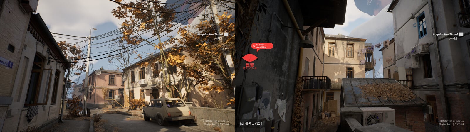 『Militsioner』のオープンプレイテストは8月21日より開始されている。筆者がプレイしてみたところ、本作のゲームプレイ映像が初披露された2021年2月12日と比べると、グラフィック面などで大幅な向上がみられる(関連記事)。またゲーム内のテキストは日本語に対応しており、本作の重要要素のひとつとなる巨大警官との問答や住民との対話なども問題なく機能している。プレイテストながらも本作の魅力であるステルスや謎解き要素を十分に体感できるボリュームとなっている。気になる人は本作を手に取り、巨大警官から監視され、法を破れば大きな手が迫りくる恐怖をぜひとも体感してみてほしい。