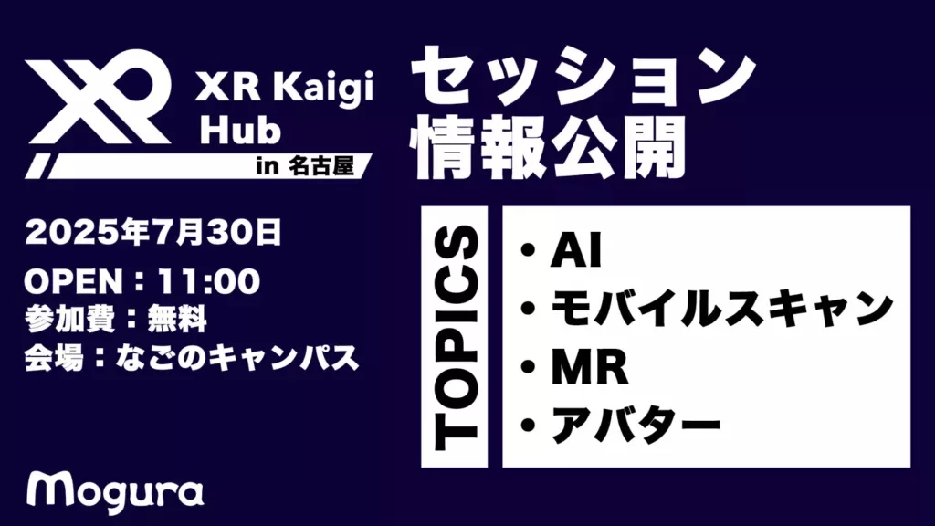 2025年7月30日(水)開催の「XR Kaigi Hub in 名古屋」のセッション情報が公開されました。場所はなごのキャンパス、入場無料(※懇親会参加は税込2,000円)です。