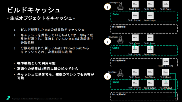 その後、私たちは「ビルドキャッシュ」を追加しました。これは、もしコードに変更がなければ、再コンパイルする必要はない、という考え方です。分散処理技術がコンパイル自体を高速化するのに対し、この技術は一部のコンパイルを完全に回避することを可能にし、ビルド時間をさらに短縮します。