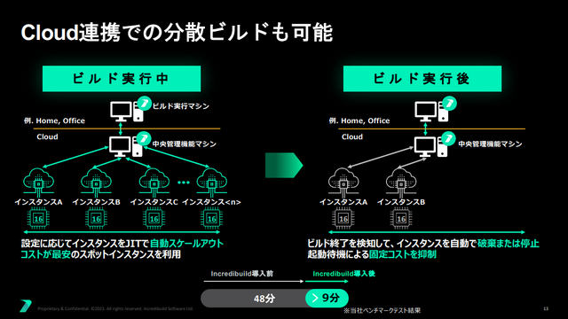 同社の開発環境では、PCのスペックが限られていた当時、1日経ってもビルドが終わらないという状況が頻繁に発生していたといいます。この課題に対し、ネットワーク上の空きリソースを活用して処理を分散させるIncredibuildのソリューションは、劇的な時間短縮を実現。ある事例では、開発時間が66%も短縮されるという成果を上げました。