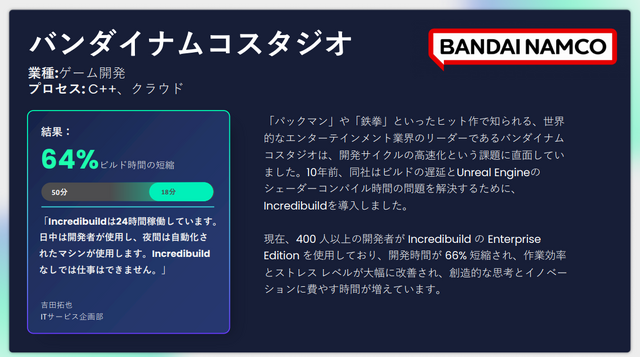 ※IncredibuildのHPより抜粋:https://www.incredibuild.com/case-studies/bandai-namco-studios