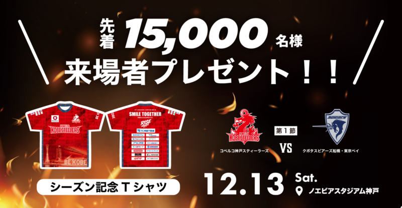 12月13日(土)にノエビアスタジアム神戸で開催されるホストゲーム開幕戦で、来場者プレゼントとして「シーズン記念Tシャツ」を先着15,000名様にプレゼントいたします。
