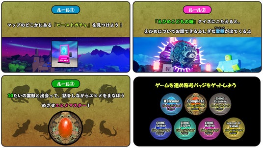 プレイヤーは、「えひめこどもの城」をモデルにした仮想空間で、AI を搭載した10 体の霊獣と自由な対話を行い、愛媛に関する謎を解きながら学びを深め、最終的に “エヒメマスター” を目指します。