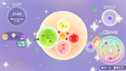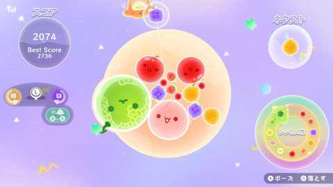 また前作では一度底の方にシンカできないフルーツを溜めてしまうと、後からそれを挽回することが難しかった。しかし今作の円形ステージではフルーツが底に沈んでいかないため、“詰んだ”状態になりにくく、リカバリーできるチャンスが多い。もし前作が上手くプレイできなかったという人でも、今作なら簡単に馴染めるのではないだろうか。