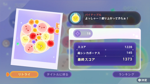 前作は四角い箱のステージで、フルーツがギチギチに詰まった状態になるため、物理演算によってフルーツが弾き飛ばされることがあった。しかし今作は円形のステージで壁がないため、そうした事故が減っているように感じられた。しかもフルーツが箱から飛び出したとしても、カウントダウン制でしばらく猶予があるため、なおさら理不尽なゲームオーバーに陥りにくい。