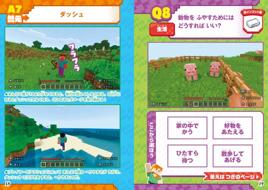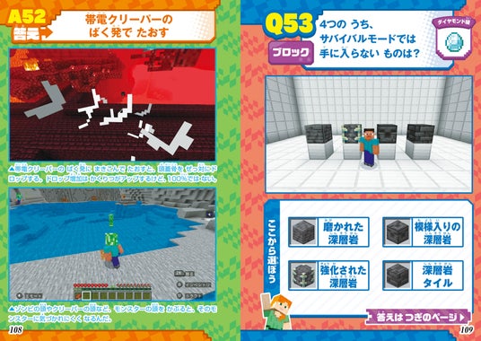 『マイクラ』のゲームに関するクイズを掲載、ページをめくるとクイズの答えとプラスの攻略情報がわかる、新しい攻略ブックが登場です。