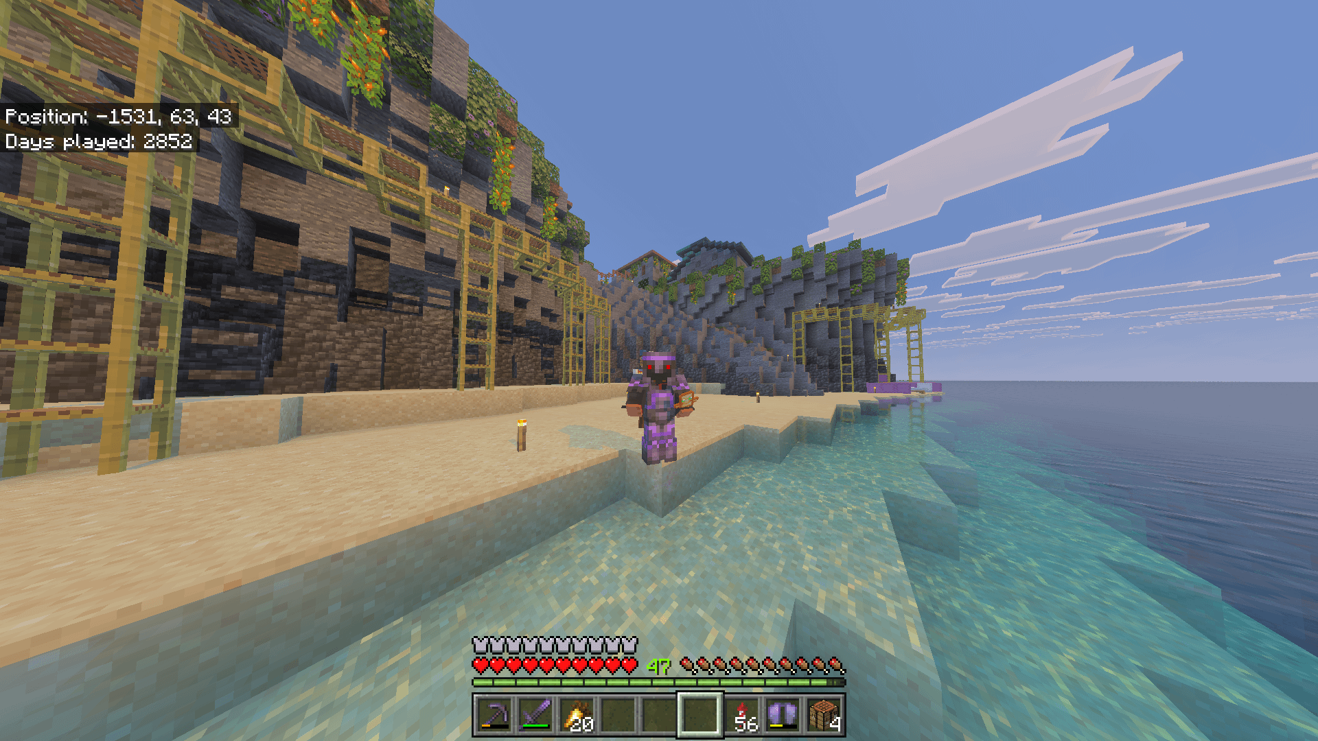 現在のテラフォーミングは完了しています (足場は無視してください。グロー地衣類を追加するときのためにあります) 崖自体をさらに改善する方法がわからないので、アドバイスがあれば幸いです。ビーチについてはアイデアがたくさんありますが、 by Lil57Fitty