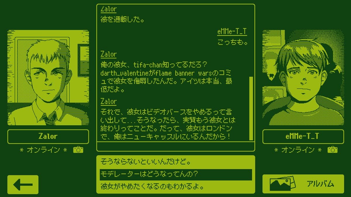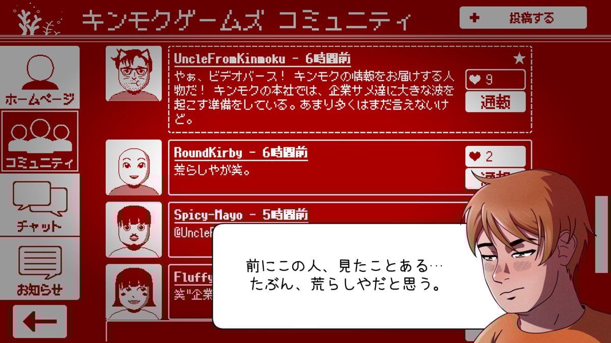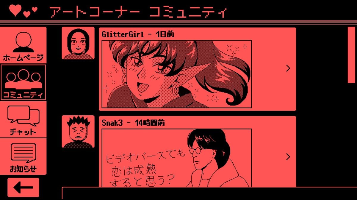 本作のゲームプレイは、Videoverseでの交流が中心だ。誰かにメッセージを送ったり、質問に選択肢で回答したり、はたまたピクセルアートを描いたりするうちに、その行動がVideoverseの状況やエメットの運命を左右していく。多彩なキャラクターとの青春物語が展開されたと思えば、はたまた企業の陰謀に巻き込まれることもある。