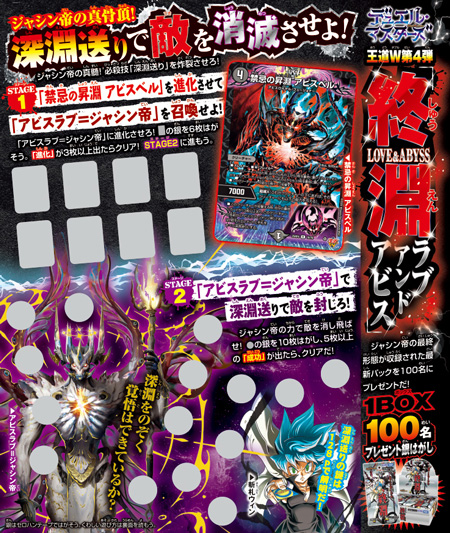 『デュエル・マスターズ』からは、王道W 第4弾「終淵 ラブ&アビス」1BOXが100名に当たるプレゼント銀はがしが登場!