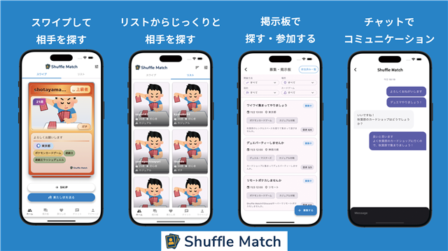 Shuffle Matchは、リアルのカードゲームにこそマッチング機能が必要だと考え、生まれました。SNSやショップイベントだけでなく、“今・ここで・自分に合う相手”と遊べる環境を、もっと多くのプレイヤーに届けたい。そんな想いから、このアプリを運営しています。