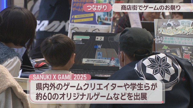 2025年は香川県内外のゲームクリエイターや学生らが手掛けたオリジナルゲームなど約60のブースが商店街のあちこちに設けられ、大人から子どもまで多くの人が楽しんでいました。