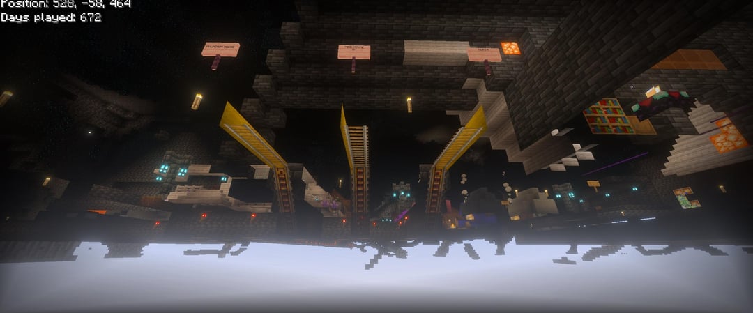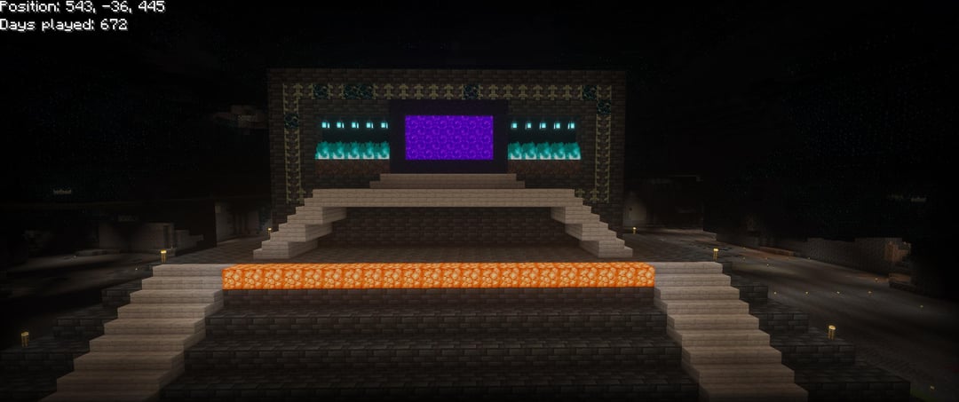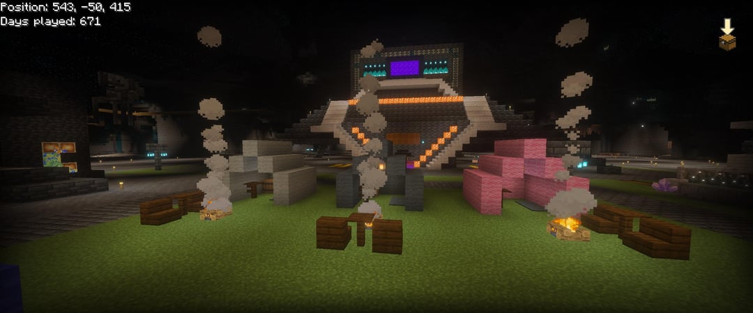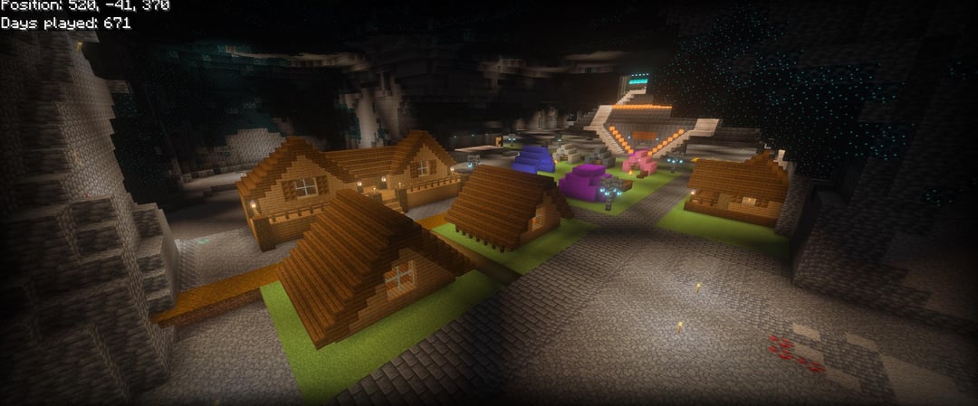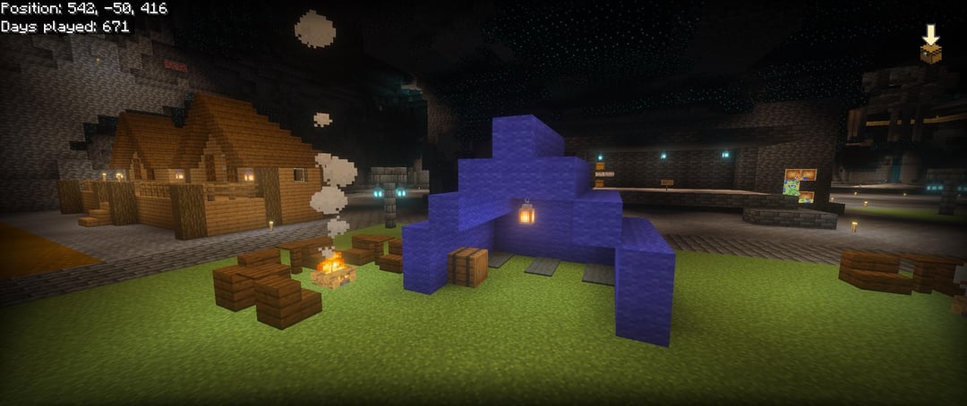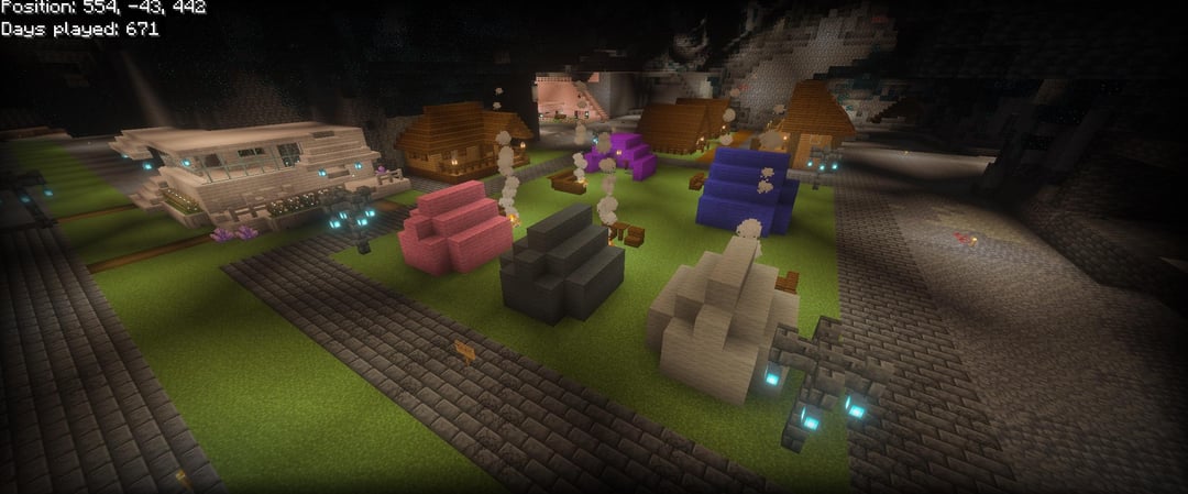私は古代都市全体を一掃し、自分の小さな都市を作りました。私はネザーポータルを都市の中心として、その下に収納スペースを設けています。マップのさまざまな場所に行く完全に機能する列車システムがあります。テントとキャビンのあるキャンプ場があります。
