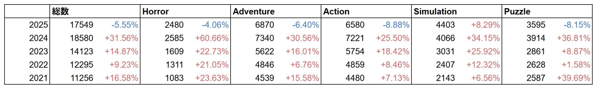 なお2024年といえば、そもそもSteamで発売されたゲームの総数も前年から急増し1万8580本であった(SteamDB)。前年比で+31.56%となっており、ホラータグの付いた作品だけが急増していたとは言い切れないように見える。そこで筆者はSteamDBにて、ホラータグのほかに、Steamのゲームにおいて2024年に上位5位を占めていた5つのタグの過去5年間の数値を確認。前年比をまとめた表は以下のとおりだ。