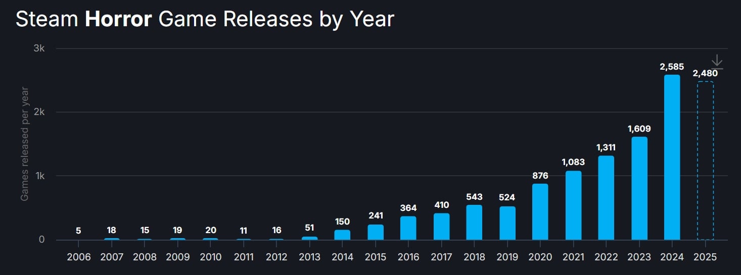 Steamにおける「ホラー(Horror)」タグが付いた新作数の年間推移が注目を集めている。ホラータグの付いたゲームが2024年にほかのタグと比べて急増し、今年も同程度の作品数が展開されているようだ。