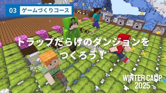 プログラミングマイクラの世界で動くオリジナルゲームをつくり、最終日にはつくったゲームをみんなでプレイします!小学2年生から推奨