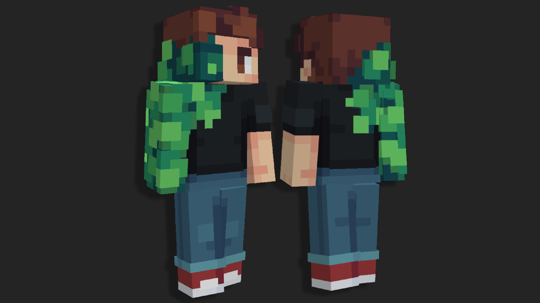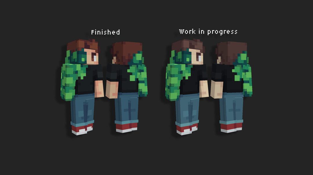 スキンをブロックベンチで作成してみたいと思いました。スキンの作成にはいつも Photoshop を使用しており、ちょうどピクセルを配置し始めたところだったからです。最初は体のどの部分も葉っぱだけだったんですが、なんだかつまらないかなと思っていました。そこで、この葉っぱのテクスチャを普通の人とメッシュ化してみることにしました。